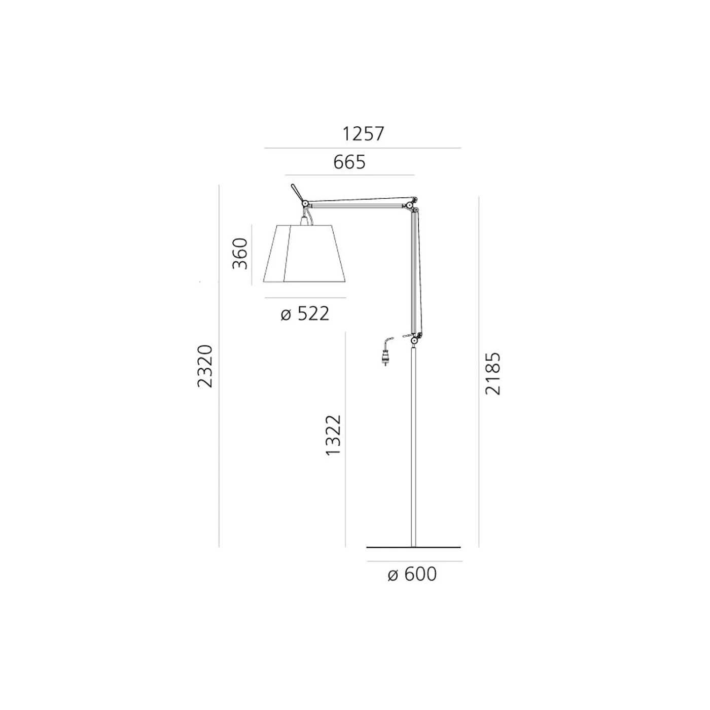 | Abmessungen | Gesamthöhe 232 cm, Gesamttiefe 125,7 cm, Schirmdurchmesser 52,2 cm, Schirmhöhe 36 cm, Sockeldurchmesser 60 cm. |