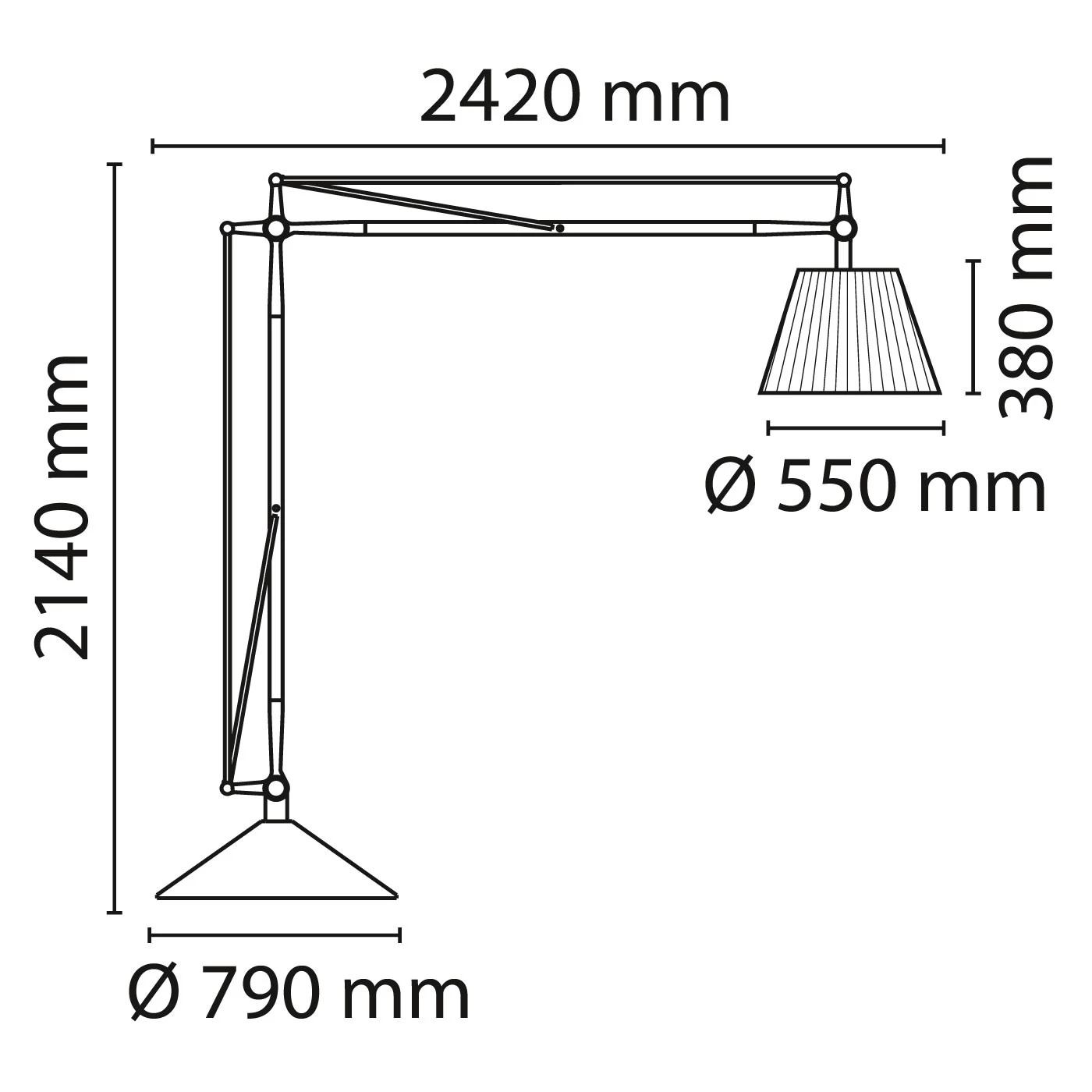 | Abmessungen | Höhe 214 cm, Tiefe 242 cm, Fußdurchmesser 79 cm, Schirmdurchmesser 58 cm, Schirmhöhe 47 cm, Gewicht 161,7 Kg. |