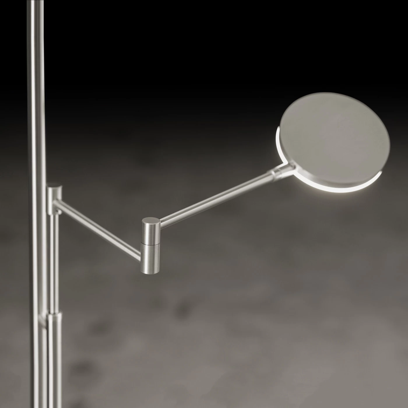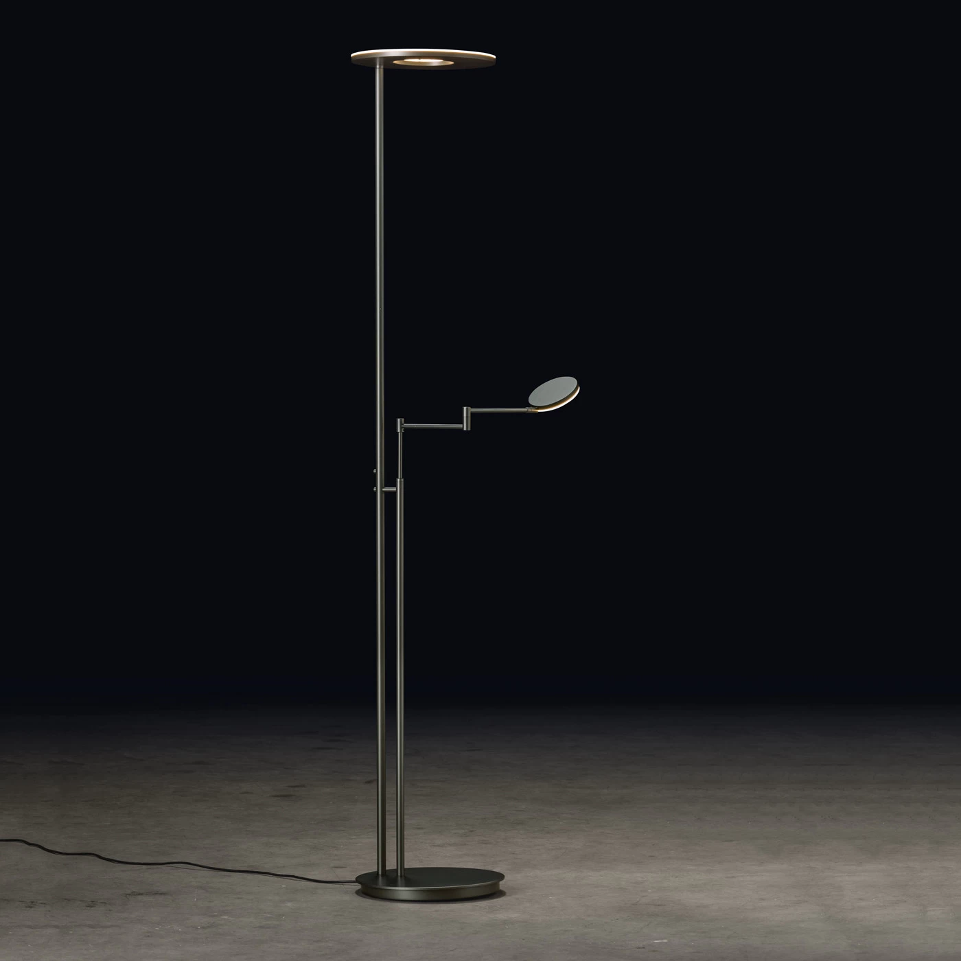 | Abmessungen | Gedamthöhe 185 cm, Höhe Leselicht min. 95 cm, max. 140 cm, Fußdurchmesser 33,2 cm, Durchmesser Deckenfluter 32 cm, Durchmesser Leselicht 12 cm, Ausladung Gelenkarm max. 53,5 cm. |